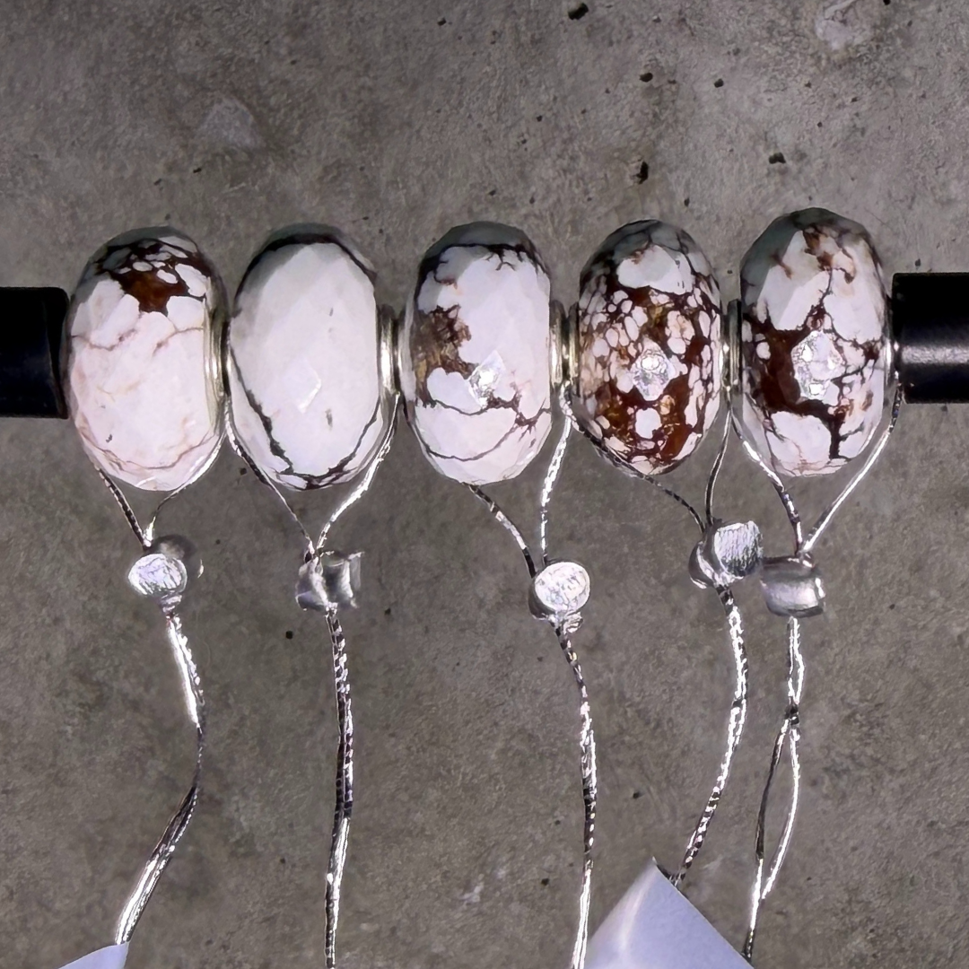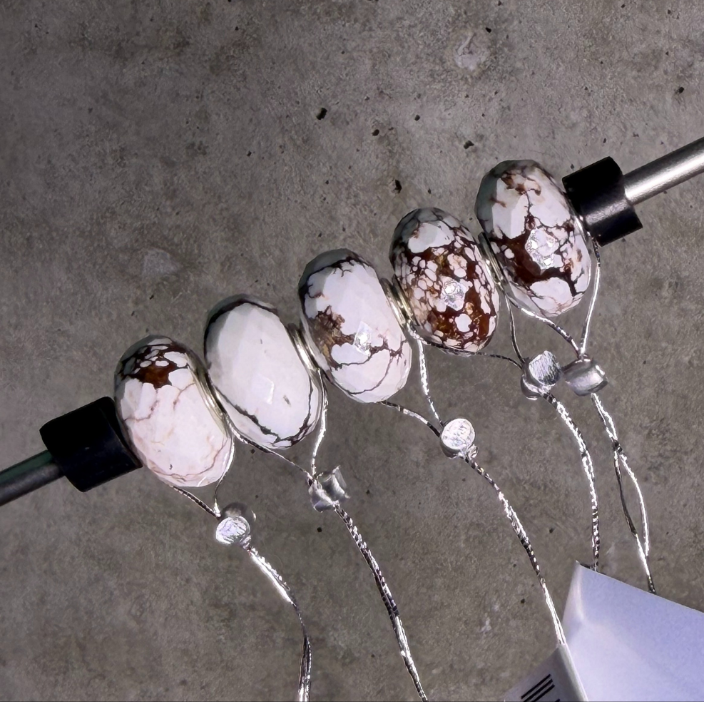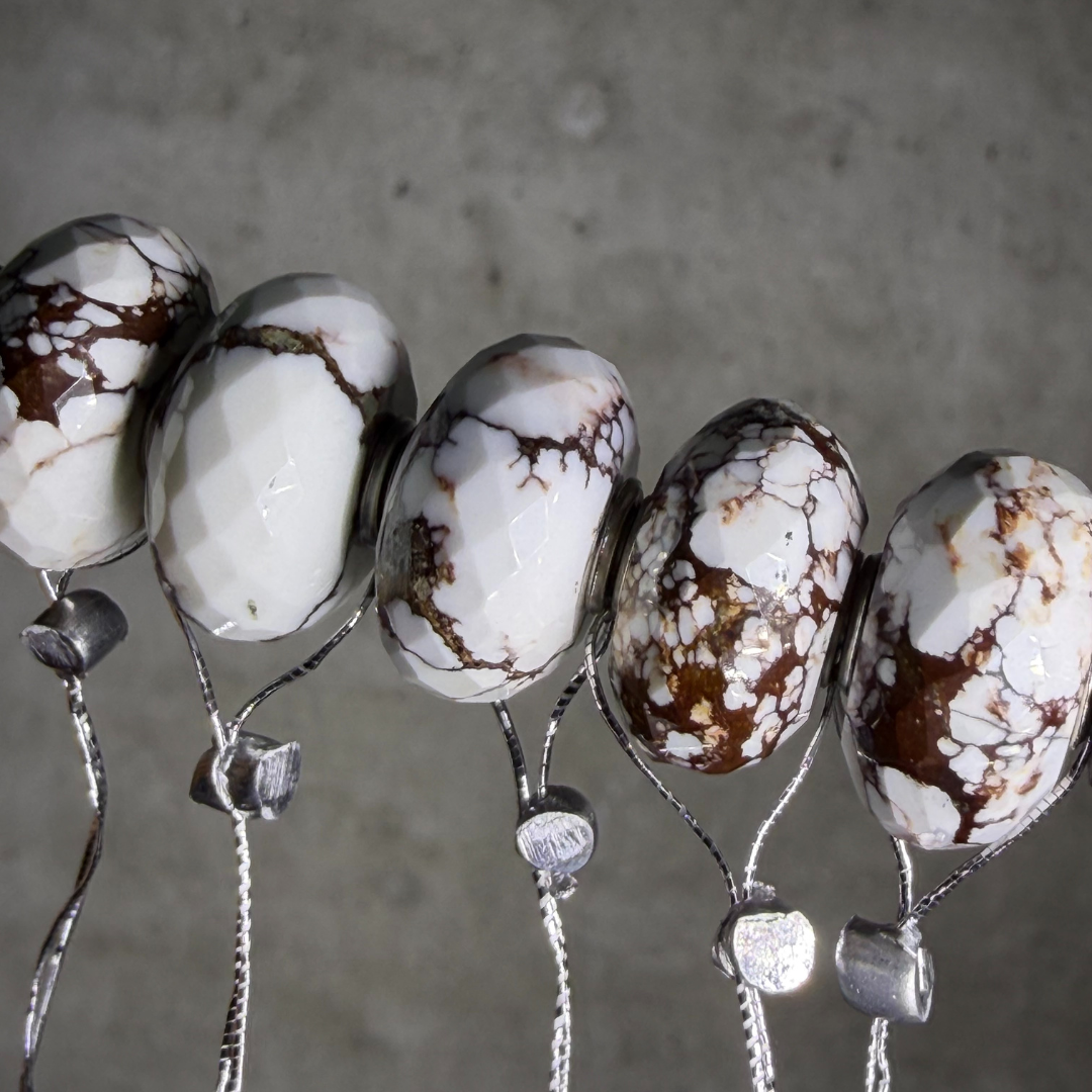 Spalvos: balta arba šviesiai kreminė su rudais raštais; kiekvienas karoliukas turi savo išskirtinę išvaizdą.